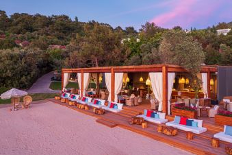 Собствен, пясъчен плаж със Син флаг и дължина от 200 м и платформа 500 m² - чадъри, шезлонги и матраци на плажа и при басейна – безплатно, плажни кърпи – срещу депозит. Частна платформа само за гости на вилите 80 m². И двете платформи са Adults Only. Кабани на плажа срещу допълнително заплащане.